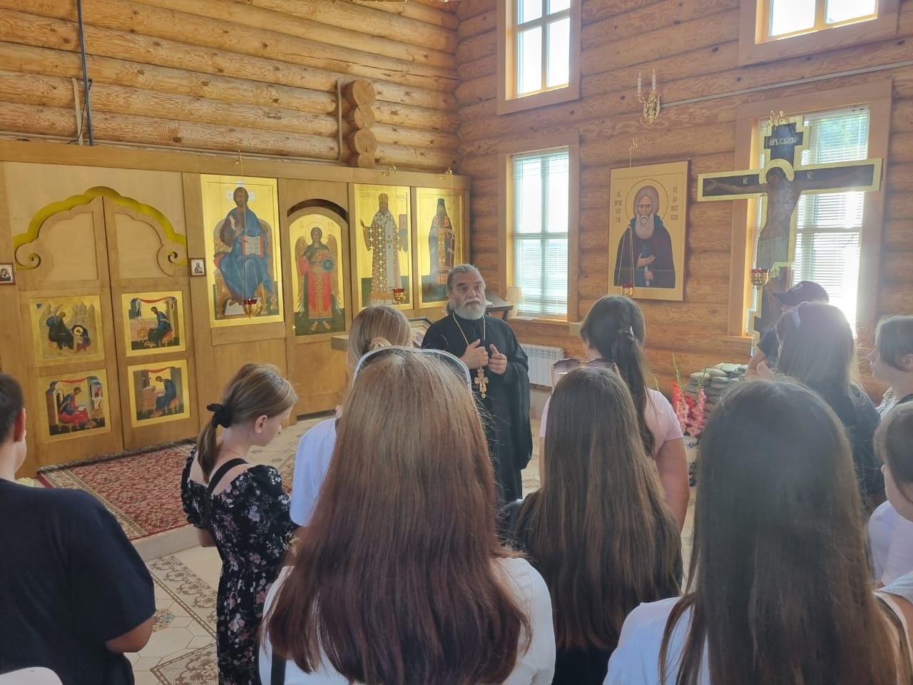 Отец Едесий провёл для ребят экскурсию по храму, показал особенности его архитектуры, рассказал о материалах, из которых сделан храм и его убранство, а также объяснил, зачем надо посещать храм, причем это делать даже в юном возрасте, проводя параллели с понятными для молодёжи вещами.