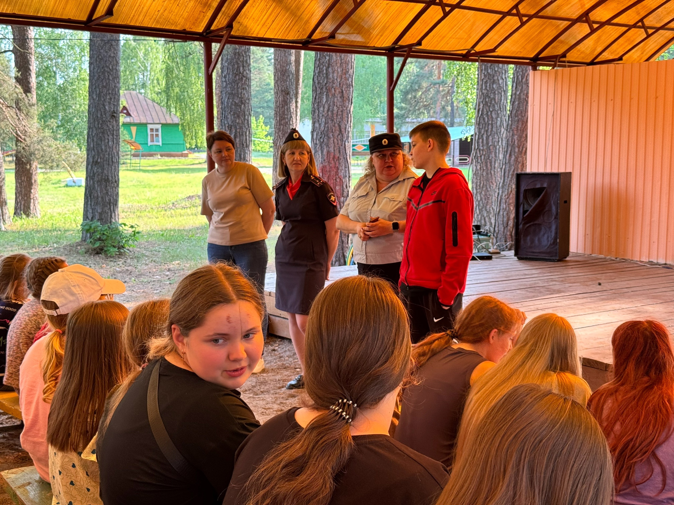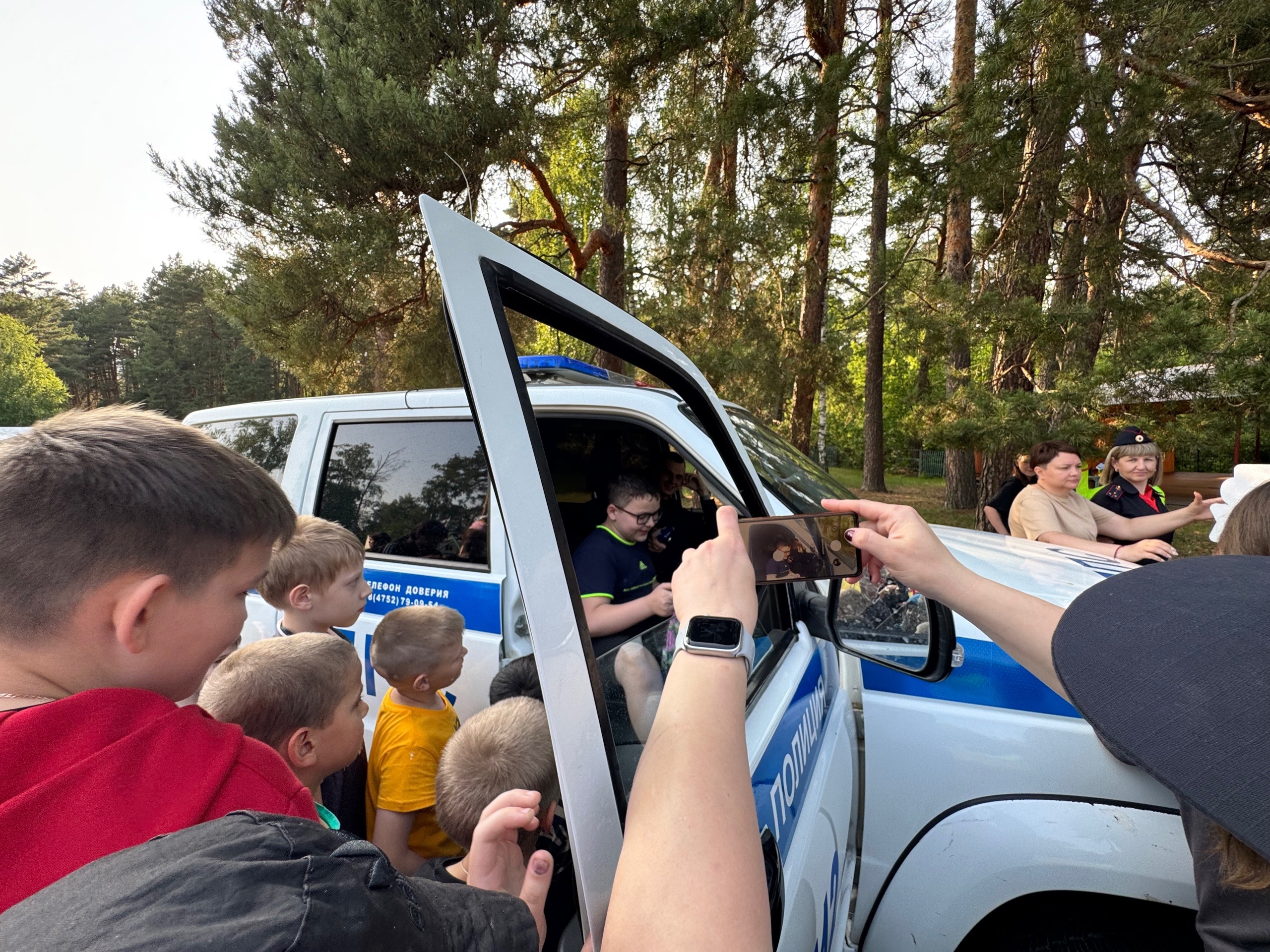 Сегодня ребята лагеря стали участниками увлекательного занятия от сотрудников Госавтоинспекции. К детям приехали инспекторы ГИБДД прямо на патрульном автомобиле!
